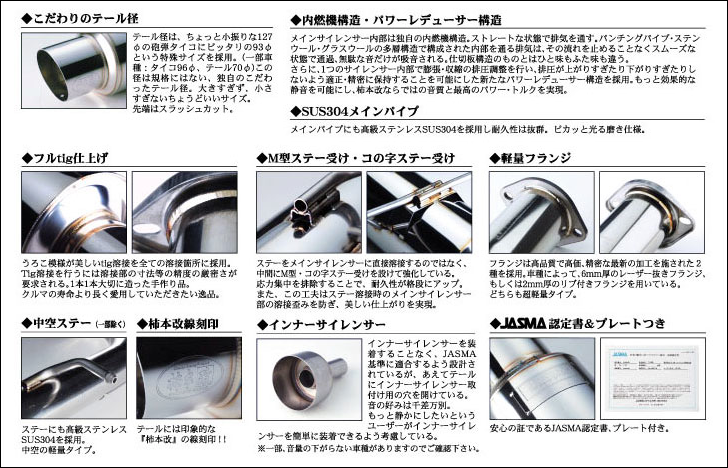 インナーサイレンサーによる消音の場合、排圧がかかりすぎて(確かに中低速は扱いやすくなるという面もあるが)本来持っている高回転域での性能を完全に出し切る事が出来ないというデメリットがある。逆にインナーサイレンサーをはずした状態になると音量は大きくなり、中低速が扱いにくくなってしまう。今回のセッティングにおいて更に、パワーレデューサー&内燃機構造、中間タイコの形状や有無は、スポーツカー用の設定をそのまま流用するのでなく、クルマ自体のコンセプトの違うこのカテゴリー用に各車種において何度もテストを行い性能を追求し、専用モデルとして開発した。