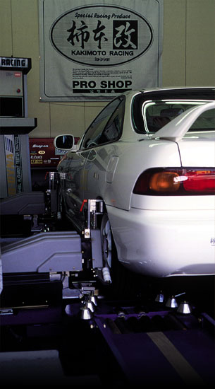 カキモトレーシングが導入している4WHELL ダイナミックアライメントテスターは高精度で、車を走行状態と同じように4輪同時に回転させ、その状態でアライメントを測定し調整を行うことができる。 静止状態で調整していくアライメントとは違い、ホイールの歪み・タイヤのたわみ・狂いが生じたり、調整時の車の上げ下げで微妙に誤差が生じてしまうこともない。 また、カキモトレーシングではハンドルを常に真っ直ぐに静止した状態で測定・調整を行なうので、調整後、ハンドルが位置が変わることなく、正確なハンドル位置のまま走行ができる。 このように誤差を最小限に抑えることができ、より正確なアライメント調整が行なえるのがカキモトレーシング所有のこのアライメントテスターだ。