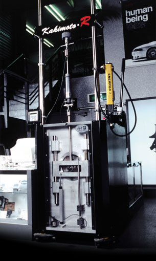 カキモトレーシングでは、欧米のフォーミュラーチームやラリーチームで多く用いられているローリグ社製ショックテスター30VS(30馬力)モデルを日本で初めて導入。 一般的に他で使用されている1馬力というような馬力の小さいテスターでも、はやいピストンスピード(0.15〜0.3m/secくらい)であれば計測できるが、 最も設計・調整が必要とされるセットアップ時(テスト走行時にドライバーが感じられるピストンスピードは0.01m/sec以下)の通常走行状態でのピストンスピードになると 馬力の小さいテスターではトルク不足のため計測は不安定になり、その信頼性は非常に低い。